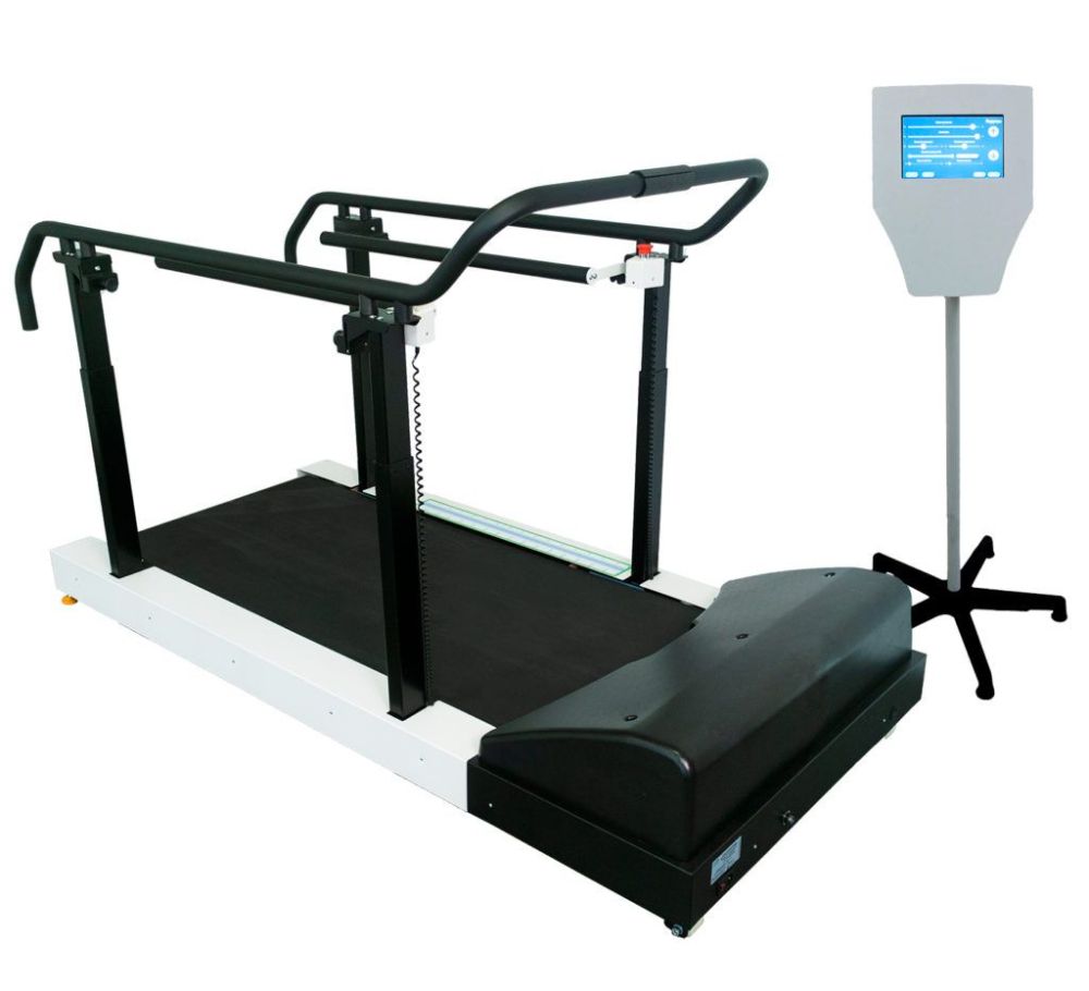 Беговая дорожка модель «Стандарт» — комплексная система реабилитации для активизации двигательных функций и восстановления навыков ходьбы с синхронизацией бегового полотна с шагом пациента и технологией БОС, позволяющая лечащему врачу параметрировать программу тренировки пациента.