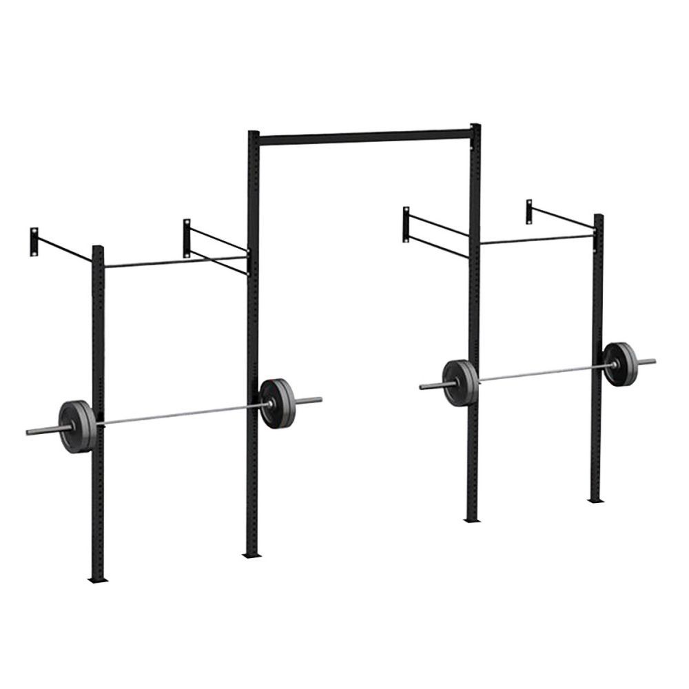 - К стене кроссфит рама крепится при помощи двойных и одинарных перекладин длиной 1120 мм (итого вынос рамы от стены - 1200 мм).