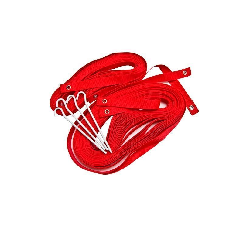 В комплекте 4 ленты шириной 5см из синтетического термо и влагоустойчивого волокна, так же стойкого к воздействию солнечных лучей, и 6 металлических колышков для фиксации, натяжки и регулировки положения разметки.