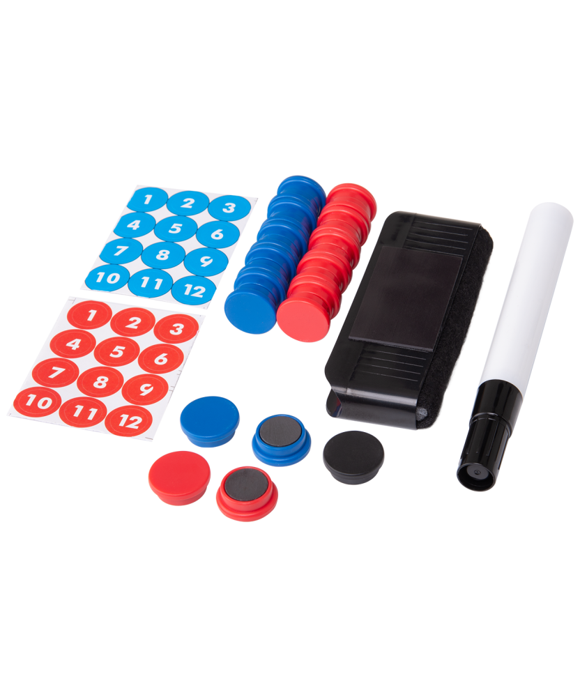 Комплектация: 12 фишек красного цвета, 12 фишек синего цвета, 1 фишка черного цвета, маркер, губка для стирания
